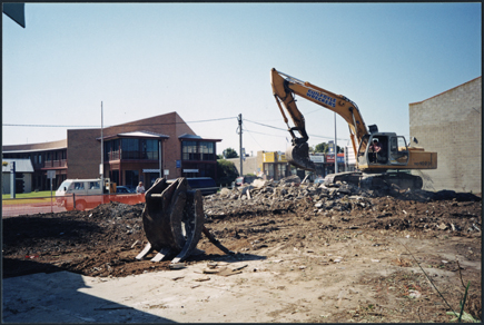 DESCRIPTIONPhoto taken of Telecom demolition site showing to right a digger machine at work, PMG yard looking toward Police Station