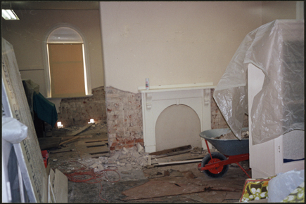 DESCRIPTIONThe image shows work being done to treat the rising damp around the window and the fireplace