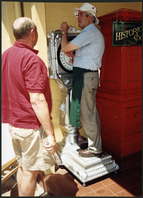 Neil Taylor standing on the new $1.00 machine installed for weight (scales), taken Australia Day 2002