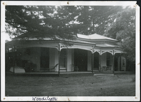 DESCRIPTIONA front view of Woodclyffe c1870, a stuccoed Italianate villa with an encircling bayed verandah, the windows being double hung and the main entry appearing to have side panels