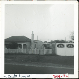 DESCRIPTIONA side view of house with verandah, hipped roof, chimney and picket fence
