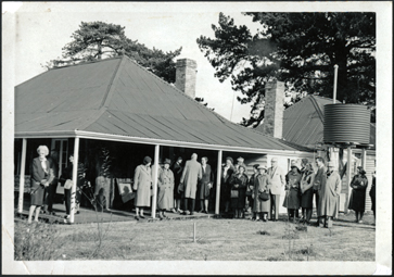 DESCRIPTIONThe image is of a hipped roof building, with verandah and two chimneys, it appears an extended building to right of photo, a water tank in front. Several people standing under verandah and in front of the building