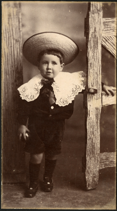 The image is of young Alfie Jarvie, in period clothes and straw hat with one hand on what appears to be a wooden gate