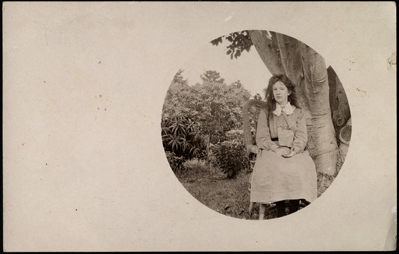 DESCRIPTIONThe image is of Leila Steedman sitting on a chair beside a tree in a garden setting, oval photo