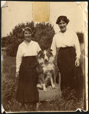 The image is of Dora and Rene Bates in an outside setting, standing on either side of their dog which is seated on a cane chair
