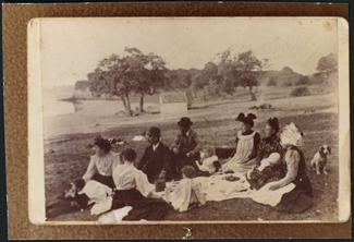 DESCRIPTIONThe Sherlock family, which in photo, comprised of seven adults and four children, at a beach at Mornington having a picnic all appear to be looking out to sea, perhaps also a family dog which is also in photo, and in the background are trees and cliffs