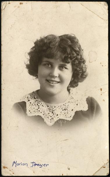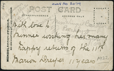 DESCRIPTIONThe image is of a smiling Marion Dreyer, the inscription on the back reads: ‘ With love to Winnie wishing her many happy returns of the 11th. Marion Dreyer. 11 years 1922’