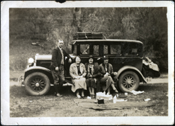 DESCRIPTIONThe image shows Bradford family members, three females and one male, having a meal break near their car on their trip to Buffalo 1933