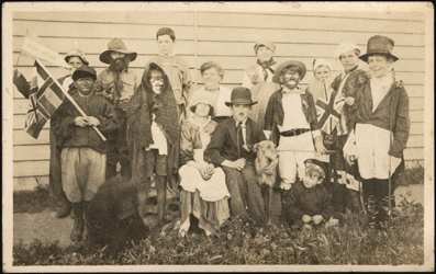 A group of children in fancy dress costumes with one adult in centre of photograph