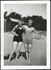 DESCRIPTIONTwo females (Stone?) in bathing costumes standing on a beach with a bathing box to the left of photo behind them