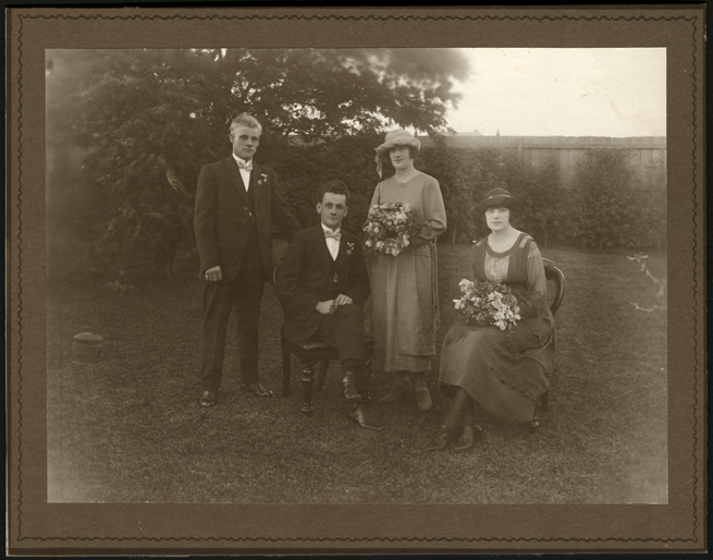 A Wedding group photo of four adults, Edwin (Ted) sitting and Alfred standing and two ladies