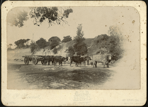 DESCRIPTIONThe image is of a bullock team with an empty wagon in front of a hilly backdrop