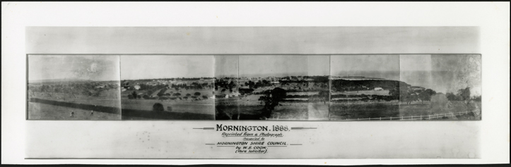 DESCRIPTIONA view of Mornington 1888, inscription under photo reads, reprinted from a photograph, 'presented to Mornington Shire Council, by W.S. Cook (Shire Solicitor)'