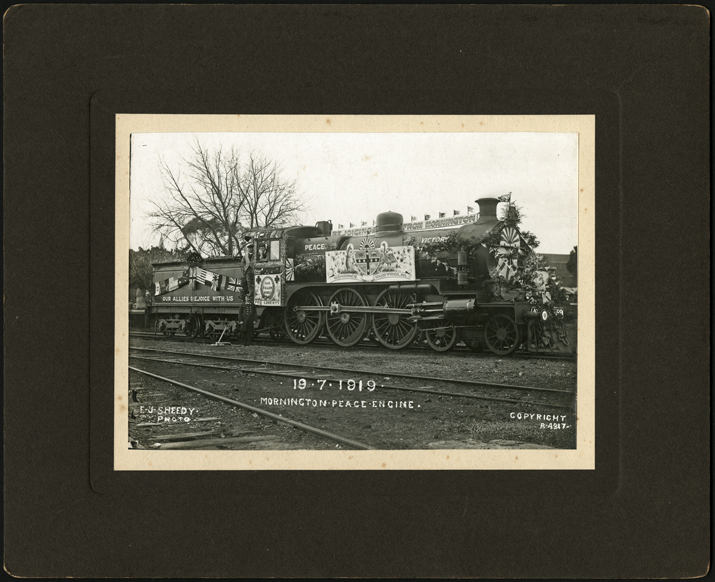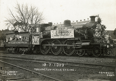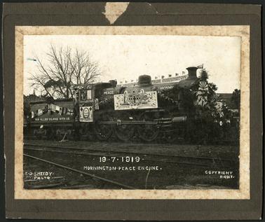 DESCRIPTIONThe Mornington Peace Train decorated with signs, flags and flowers, two men in driver's compartment and perhaps conductor standing near train