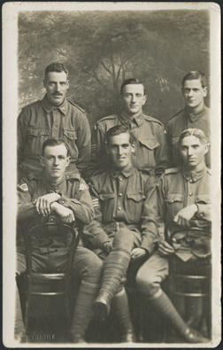 DESCRIPTIONA group photo of six members of the 24th Battallion 6th Brigade, names of those in photo are Harry Bunce, Ernie White, Harry Harrison ???