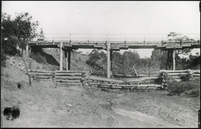 Image shows wooden trestle bridge over Tanti Creek in foreground log fence