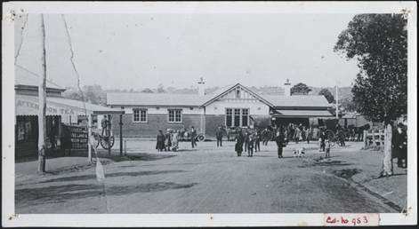DESCRIPTIONImage shows passengers departing the Railway Station, two horse and buggy cabs waiting in front of the station, to the left of the photo is the Ladies Waiting Room opposite the Blake Street Tea Shop