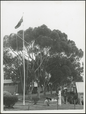 The image shows a Minister dedicating a service at the plaque and flag to those Apprentices who died in action,