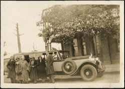 DESCRIPTIONA close-up photo of a group of friends posing in front of their Packard car during their touring, the Royal Hotel behind them in photo