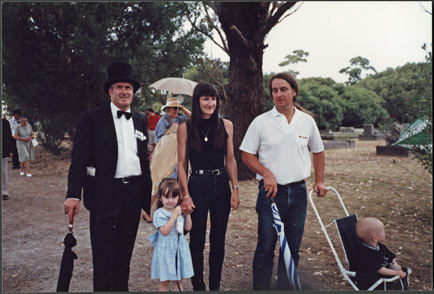 DESCRIPTIONA group photo with Neil Taylor in top hat, and members of the Downward family, when attending the Mornington Shire Centenary for the Mornington Cemetery