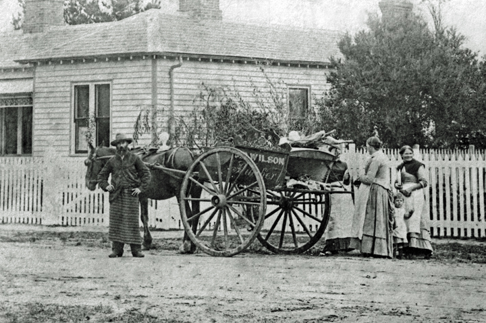 DESCRIPTIONThis shows a horse and cart in front of a weather board house with a picket fence. There is a bearded gentleman next to the horse with his hands on his hips. He is wearing a hat and a striped apron. There are three ladies in Victorian dress and a small child at the rear of the cart. On the side of the cart there is the name “Wilson Butcher”.