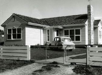 DESCRIPTIONThis shows a white weather board house with a tiled roof, and a car parked in the front garden. There is a white wooden fence, with wire gates.