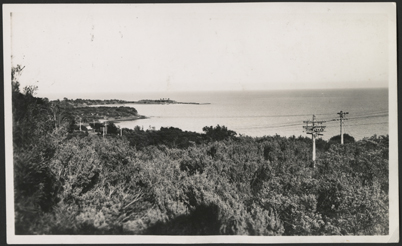 DESCRIPTIONThis is a view from the tree tops on the top of Beleura Hill looking out across Port Philip Bay toward the Pier Mornington. There are very few houses visible, and the land is covered in vegetation. There are telegraph poles visible.
