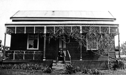 DESCRIPTIONOld double fronted dark weather board house with corrugated iron roof and bull-nosed verandah. A man is seated on the front verandah with his feet on one of three steps to the front yard.