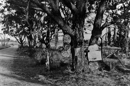 DESCRIPTIONGroup of trees beside a dirt road. The large tree in the foreground has several signs attached which are illegible at this distance. The dead bodies of several foxes hang from each side of the tree indicating numbers trapped by two local trappers, Jack Johnson and Lou Connell. Jack Johnson was murdered in 1946 by a man named McKenzie. . The reason why was never discovered.