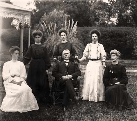 DESCRIPTIONA family group of people pictured in a garden near the corner of a verandah. An elderly man is seated between an older and a younger woman with three young women standing at the rear. The verandah has an iron lace frieze and the figures are in front of some shrubs in a neat garden which is bordered by a hedge.