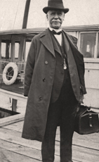 DESCRIPTIONWell-dressed elderly man in hat and overcoat, carrying a gladstone bag. He stands on a wooden jetty in front of a ferry.