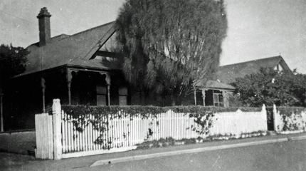 DESCRIPTIONAn Edwardian single storied house with verandah behind a white picket fence on the street.The house has a pitched roof with a single, tall chimney. There is a driveway on the left with open gates, a small pedestrian gateway to the right and a tall tree between house and fence. A shrub conceals what appears to be an extension of the house.