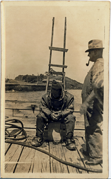 DESCRIPTIONTwo men on the edge of Mornington Pier. One is in diving gear with a large heavy brass and glass full head helmet and seated on a rung of a ladder which is roped to the pier. The other man, who is dressed in work clothes and a hat, is standing beside him, smoking a pipe. There is a hill in the background.