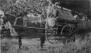 DESCRIPTIONHorse and covered cart labelled Tubba Rubba Prospectors with a bucket hanging from the apex of the covering. A man and a woman are seated behind the horse and are dressed in clothes appropriate to the previous century. The horse and cart are on rough grass in front of a paling fence. The front of a car or truck, licence number 83276, is in the background to the left.