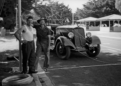 DESCRIPTIONIn the foreground two men are standing beside an open roadster, registration 81.056. The bare headed man on the left is Max Pender of the C.F.A., the identity of the man on the right in army hat is unknown. A fire bell, fire tower and two rotundas are in the background in front of a line of trees beside the training track.