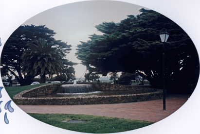 DESCRIPTIONThis is a frontal view of a fountain at one end of a circular brown stone wall. A low jet of water falls on to a platform creating the effect of a waterfall. The remainder of the enclosed ground is covered in shallow water. There is no visible outlet for the water. There is a cypress tree on either side between the stone wall and the sea. A white poat and rail fence stands between the edge of the park and the sea which appears in the background. Several cars are parked near the fence.