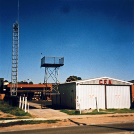 DESCRIPTIONThe rear of a terracotta coloured single story building is in the background with a tall metal tower on the left and a shed close to the footpath on the right. The shed has the letters CFA on its upper facade and beside it is a blue tank on a metal stand about double the height of the building and a pathway leads from the street to the rear building.