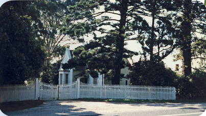 DESCRIPTIONA small white Gothic revival house behind a low, white picket fence with closed double gates and a gravel entrance. It is surrounded by trees including a eucalypt, a fine specimen of a pine tree and shrubs. It stands beside a main road with an asphalted surface.