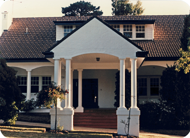 DESCRIPTIONA double fronted white house with a trio of casement windows on each side of the main entrance and a second floor room with similar windows is set in the tiled roof. The front door opens from a verandah which is defined by slim, white pillars and approached from the driveway by a set of terracotta steps. The driveway in front is spanned by a portico of similar white pillars.