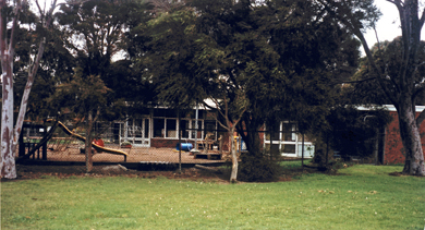 DESCRIPTIONTimber and brick single storied preschool with windows along most of frontage. Photo shows building behind a high wire fence, and partially hidden by trees. Playground equipment visible behind wire fence. Photo title on back indicates land was owned by Downward family.