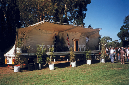 DESCRIPTIONTemporary stage comprising a large flat tray (of a truck) on wheels, with a canvas awning erected as back wall and roof. Pot plants are on the stage and on the ground in front of the stage, and a microphone and lectern are set up centre stage. A group of well dressed people mostly wearing hats are standing to the right with backs to the photo. White plastic chairs and a large American and an Australian flag are on the stage, presumably at Balcombe Army Camp for 2001 ceremony.