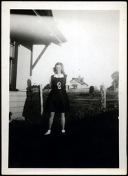 DESCRIPTIONThis photograph shows a young woman in her hockey uniform. She is wearing a white blouse and a gym slip type garment with an insignia on the front. She is smiling and has her hands behind her back. She has white socks. She is standing in the garden of a weather board house, and another house with a pitched roof is shown in the background. The sun is shining as there is a strong shadow.