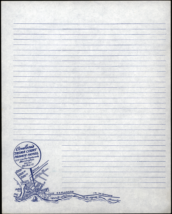 DESCRIPTIONThis photograph is of a piece of lined note paper. In the bottom left hand corner it states: Coulson’s Tasma Court Private Hotel, The Esplanade, Mornington. 52131 P.O. Box 17. The printing is in blue.