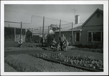 DESCRIPTIONThis photo shows the garden and tennis court of Tasma Court Hotel. There is a vegetable patch in the foreground. A group of people are in the garden, two women are seated, and a gentleman standing alongside. He is wearing a three piece suit, shirt and tie. There is a white weather board building to the right of the photo.