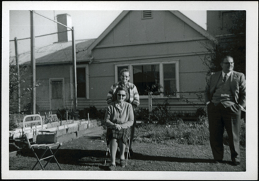 DESCRIPTIONThis image shows two women and a man in the garden at Tasma Court. One woman is seated and the other is standing behind her chair. The gentleman is standing apart to the very right of the picture. He is wearing a three piece suite, shirt and tie. They all have spectacles. There is a building directly behind them, which looks to be built of weather board and fibro sheeting.