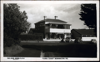 HISTORYTasma Court was a large guest house between Tasma Lane and Canterbury Street from the 1870’s until the 1970’s when it was demolished. The main building was brick two storeys with 13 rooms, large weather board dining room, an adjoining weather board dwelling of 11 rooms and a tennis court. It was originally known as as Canterbury House later as Holcomb House and from the late 1930’s as Tasma Court, from which the current unit complex takes its name. The Mornington museum has examples of Holcomb House crockery. Mrs P. Butler was the proprietress, and the phone number was Mornington 131. Some guests were residential guests, not just holiday rentals.