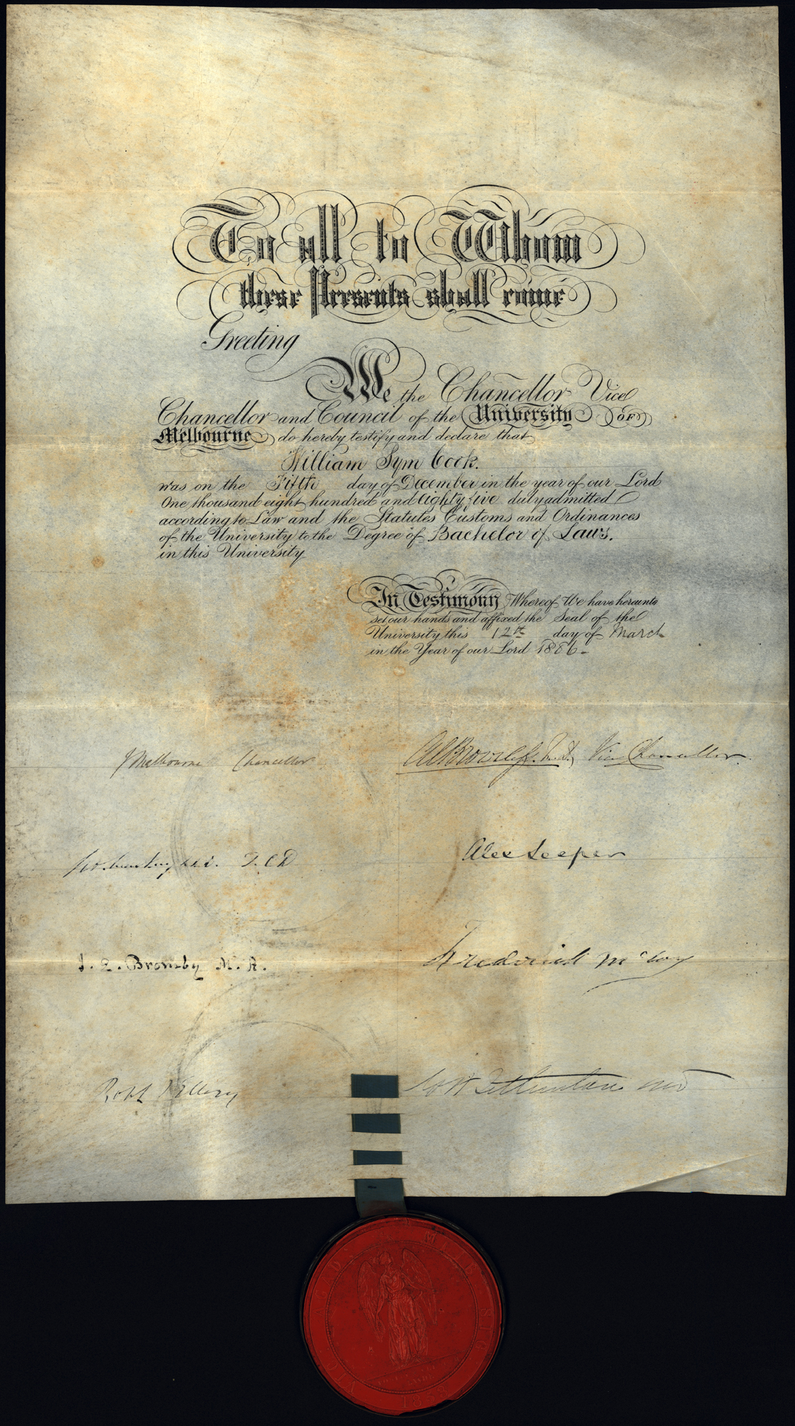 This is a photograph of a degree document for William Sym Cook from the University of Melbourne. He became a Batchelor of Law. The date on the bottom of the document is the 12th March, 1886.