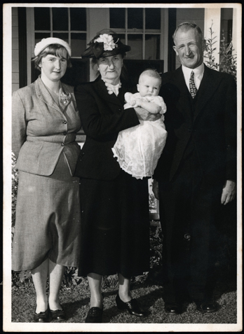 DESCRIPTION1. This shows a group of three people and a baby. There is an older couple with a younger woman. The older woman is holding the baby. The two women are wearing hats, and they all look very smart.