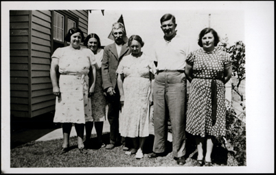2. This photo shows a group of four women and two men. They are all in summer clothes, but one man is wearing a jacket. They are standing on the grass next to a weather board building.