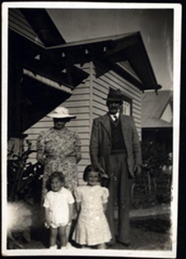 3. This is an image of a family group. A man and woman and two small children. They are all standing outside a weather board house. The woman is wearing a floral summer dress, and a white hat. The gentleman is wearing a suit with a white shirt and tie, and trilby hat.